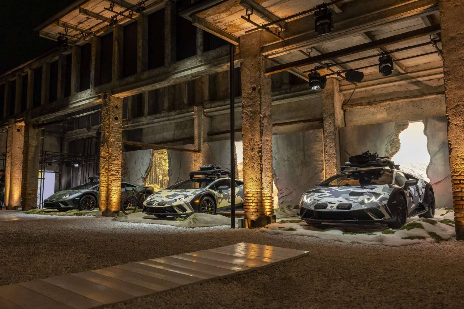 Mais il était quand même étrange que Lamborghini ait décidé de dévoiler la Huracan Sterrato All-Terrain à la Milan Design Week. L’hypercar sur les images présente quatre décorations de carrosserie différentes, conçues par le studio Ad Personam de l’entreprise. Pour chacune des finitions, les designers se sont inspirés de thèmes tels que « la neige, le sable, les sentiers de terre et le terrain aride du désert ».